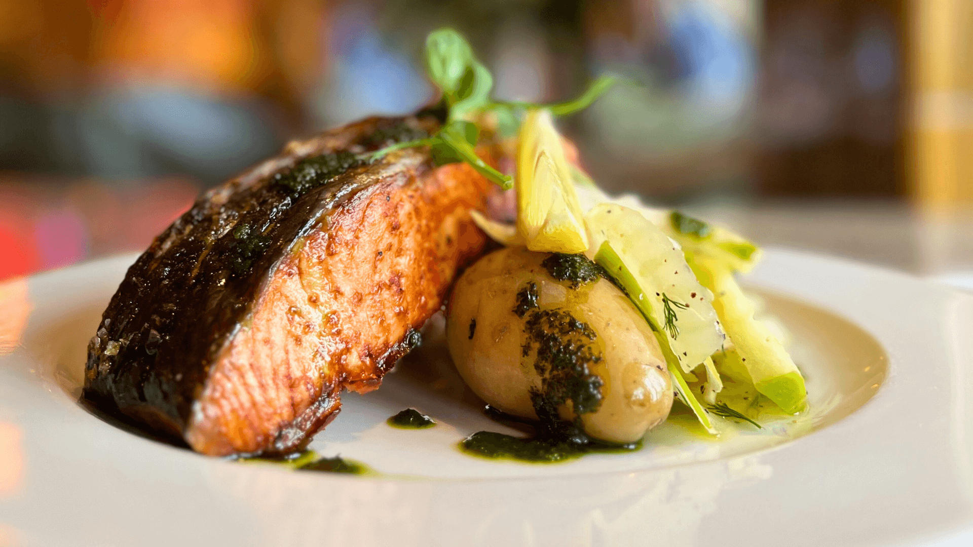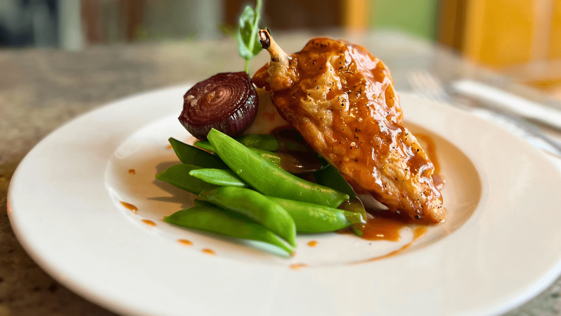 Grilled salmon and potatoes served with fresh greens in an elegant dining setting.Elegant chicken dish with pea pods and glazed onion at an upscale dining setting.